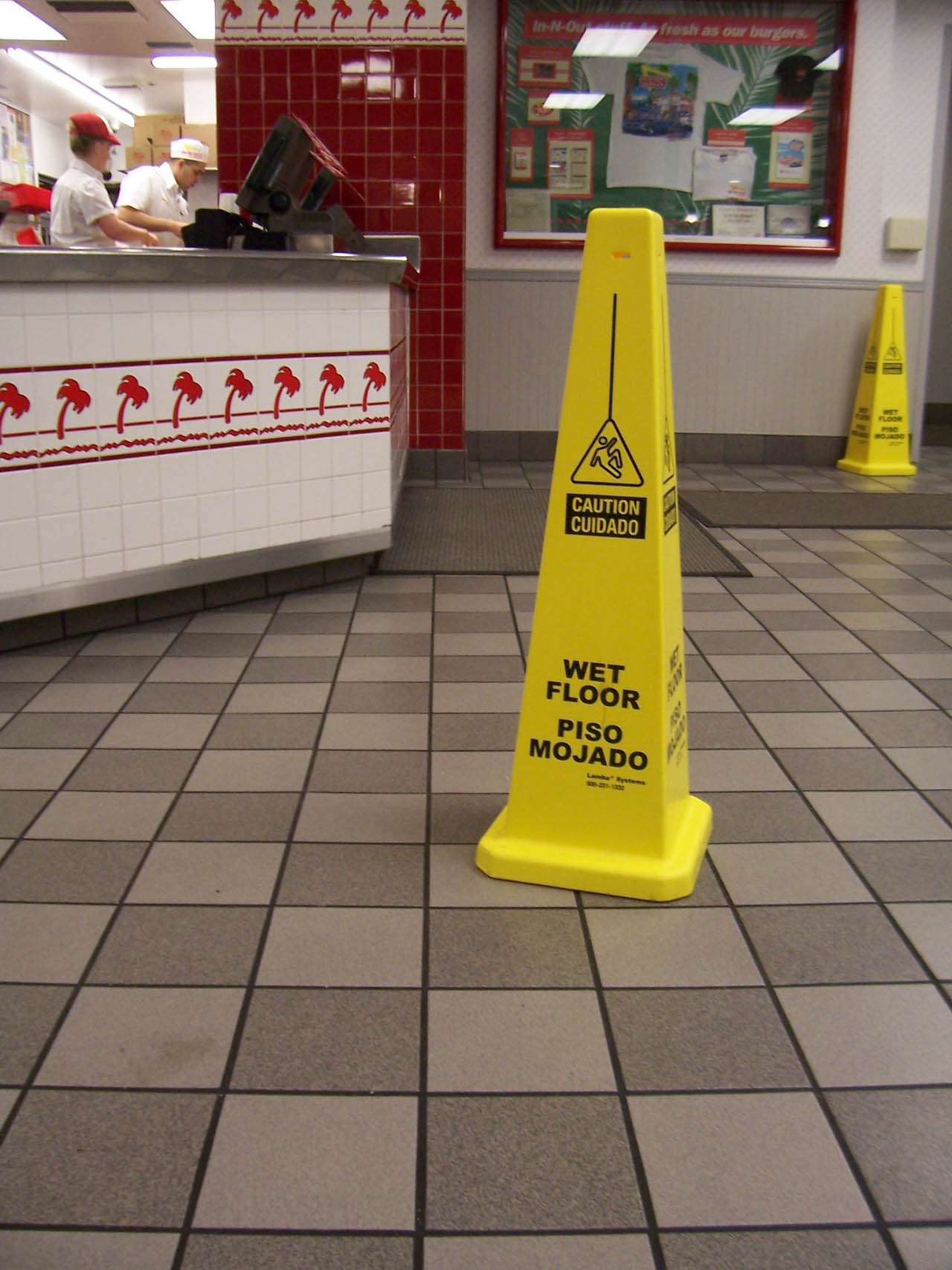 Guess what, I know Spanish! "Piso Mojado" means "Wet Floor"! Also, that guy looks more like he's break dancing, than falling.