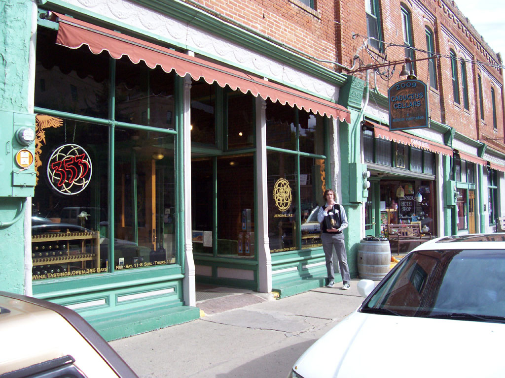 The outside of the tasting room, on the second level of Jerome's streets. An old fashioned store front, in the old mining town style.